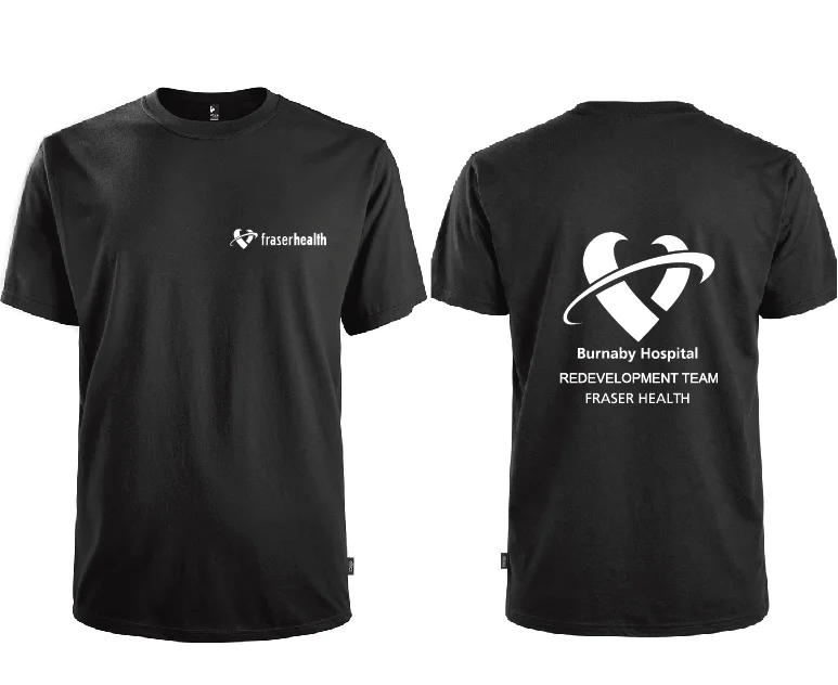Description Description Price includes Fraser Health logo printed on the left chest and the Burnaby Hospital Redevelopment Team logo printed on the back.Jersey 100 % organic cotton finest count ring spun fully combed. 150 g/m² (7 oz).Union made in Canada.