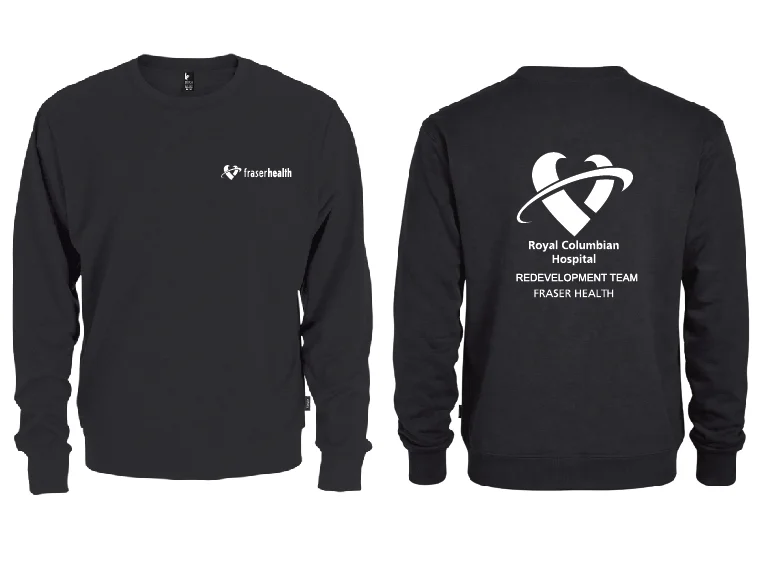 Price includes Fraser Health logo printed on the left chest and the Royal Columbian Hospital Redevelopment Team logo printed on the back.